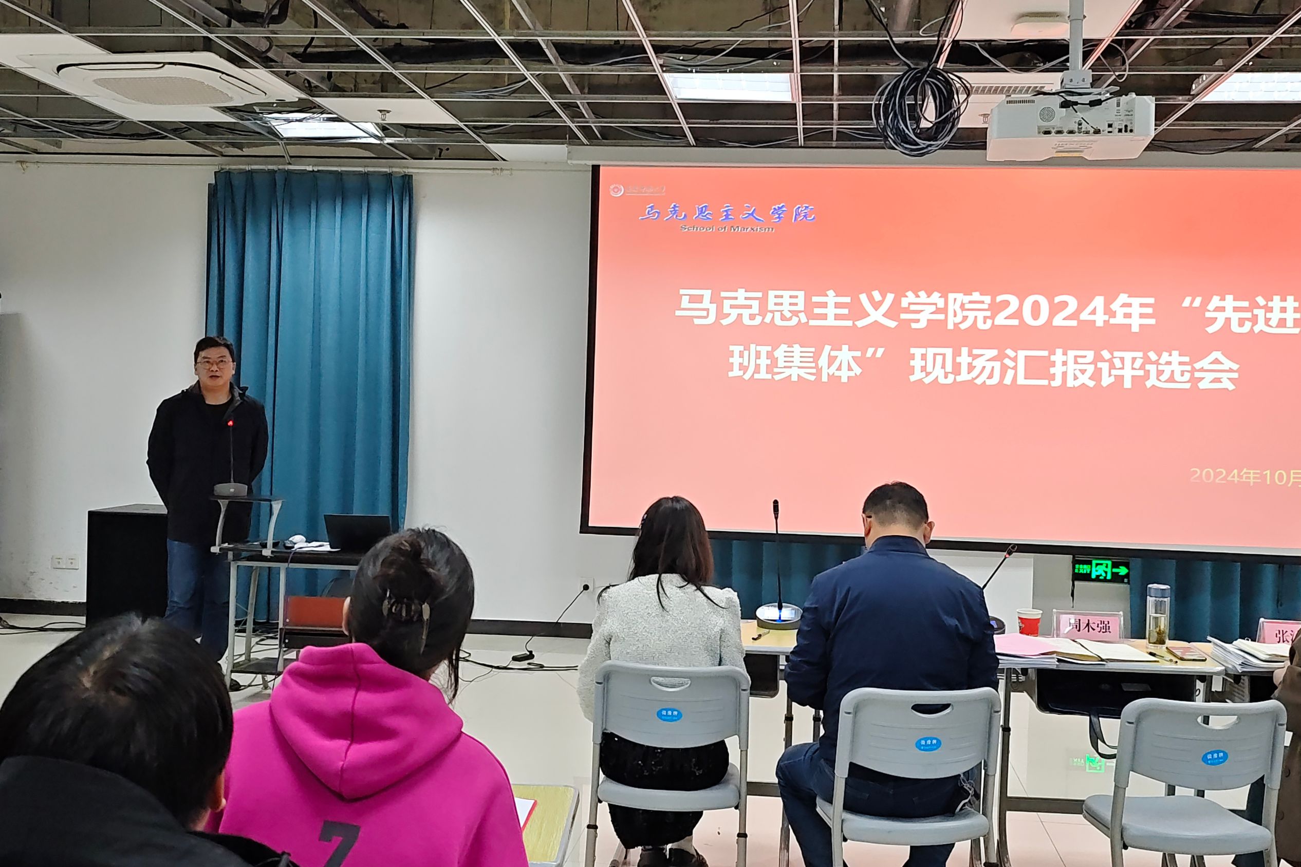 10月31日下午,学院在Q楼119教室召开2023—2024学年先进班级评选会议。学生工作处副处长周木强、学院副院长余江舟、外国语学院辅导员张沐阳、学院教师徐辉、王一丹作为评委老师出席会议。同时参会的还有学院专兼职辅导员、各参评班级代表共80余人。