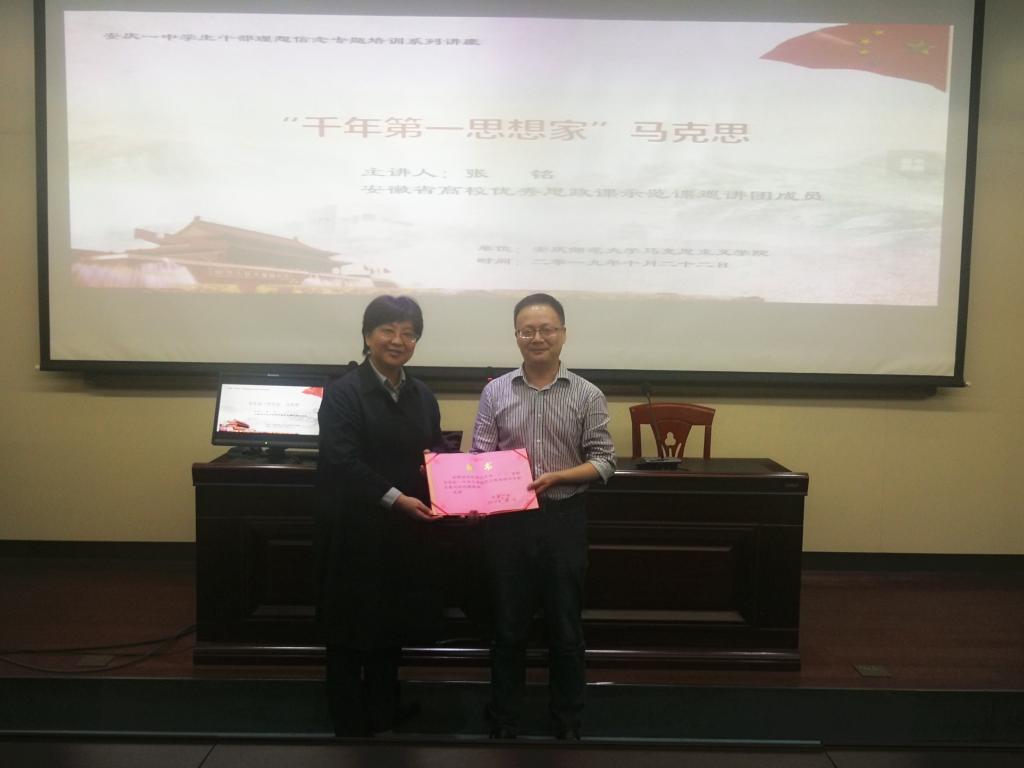 平时,张铭在教学中经常将原理知识与学生成长成才相结合,用校园里同学们身边人和事来激励学生。有一次,张铭带了黄梅戏表演专业的马克思主义基本原理课,这个班准备举办黄梅戏表演汇演,但由于经费、场地、人员的问题,活动流产了。张铭得知情况后,在讲述“主体选择与社会历史趋向”知识点时,将这次活动流产与人文学院《王步文》话剧举办成功的事例进行对比,让学生比较两者不同结果的原因,引导他们意识到个人的选择应当与社会发展的相结合,进而增强他们建设中国特色社会主义的理想信念。