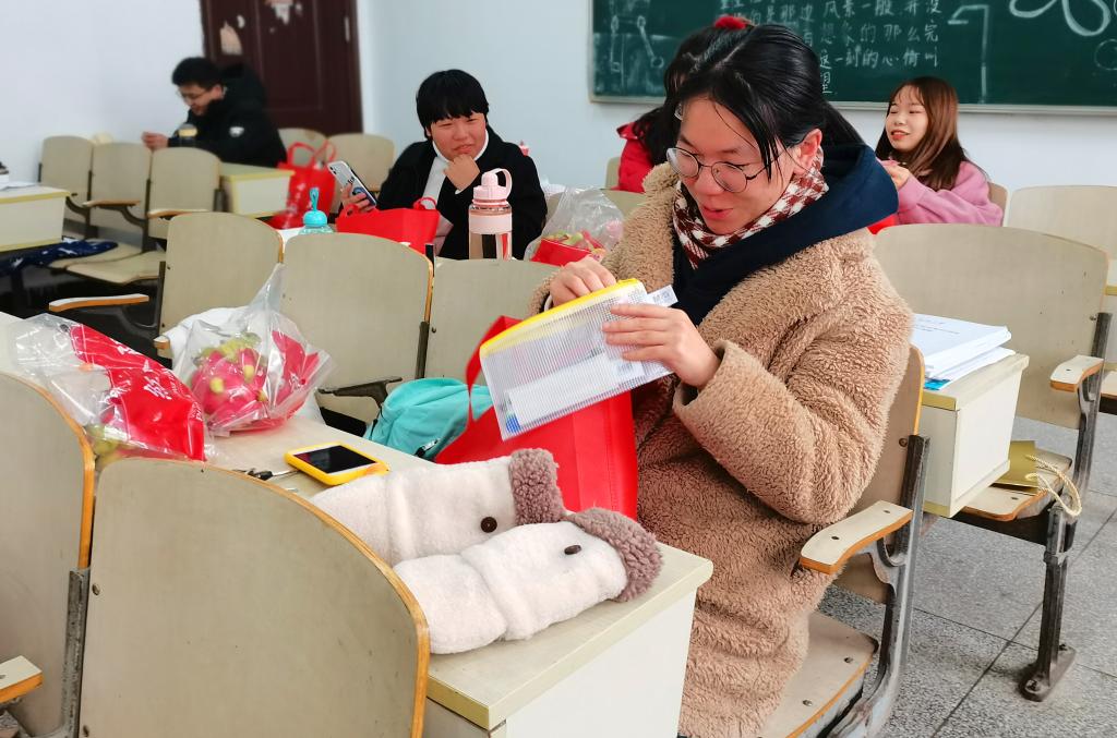 11月26日下午,beat365在线唯一官网的57名考研学子在班会上收到学院各级学弟学妹们准备的定制福袋,福袋内装有爱心信、考研必备文具和水果大礼包等花式礼物。比起精神鼓励,考研学子们表示:“这种精心准备的福袋更加暖心。”