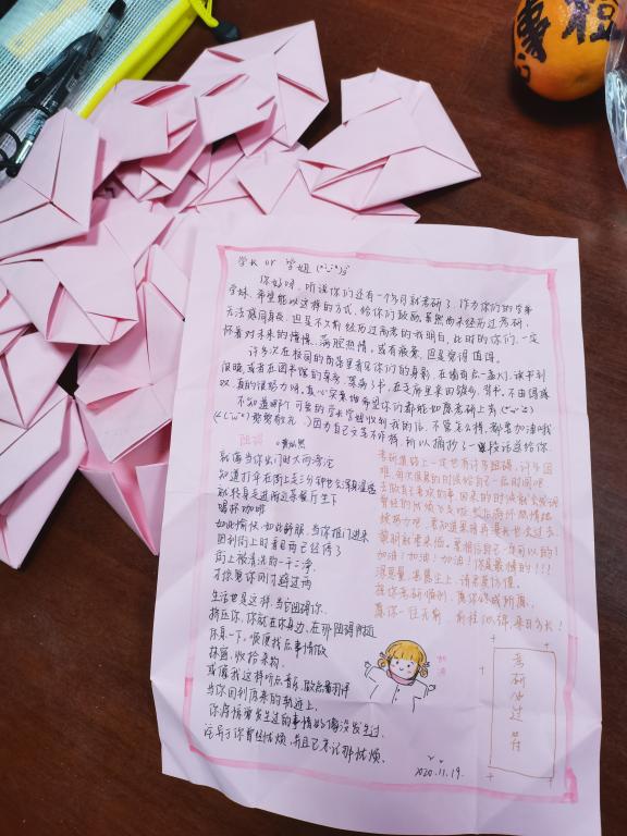 “这是一个考研顺利符,收到礼物的人一定会考出理想的成绩!”“越努力越幸运,保持状态,考研加油!”……一张张被折成爱心的信封上写满了对考研学子的热诚寄语,也都是由2020级beat365在线唯一官网新生们亲手制作。思想政治教育专业2020(2)班的李萍就是写爱心信的新生之一,“大一刚进校园也收到过学长学姐给我们的爱心信,现在由我们新生给学长学姐写信,这也是一个温暖传递的过程。”