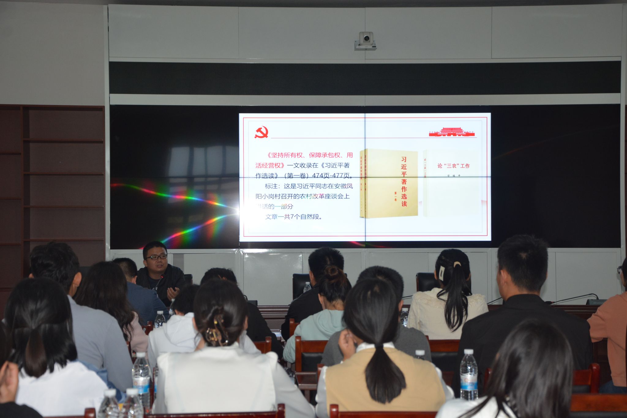实地参观后,学院师生来到小岗村游客中心会议室召开交流研讨会。学院教师陈道发博士进行了现场思政课教学。陈道发博士结合小岗村改革实际,从改革的主线、改革的目的、改革的策略、改革的重点、改革的底线、改革的路径六个方面深入解读了习近平总书记在农村改革座谈会上的重要讲话,加深了同学们对解决“三农”问题,实施乡村振兴战略重要性的认识,使同学们的责任感和使命感进一步增强。同学们分为五组进行交流研讨,并推选出代表进行总结,各组代表就小岗村蜕变的成功经验、如何传承小岗精神等进行了深刻发言,领学老师对各组发言进行了点评。陈道发对各组代表的发言给予充分肯定,并指出同学们要从小岗村波澜壮阔的发展历史中汲取红色力量,在今后的学习和工作中要敢为人先,不断奋斗。