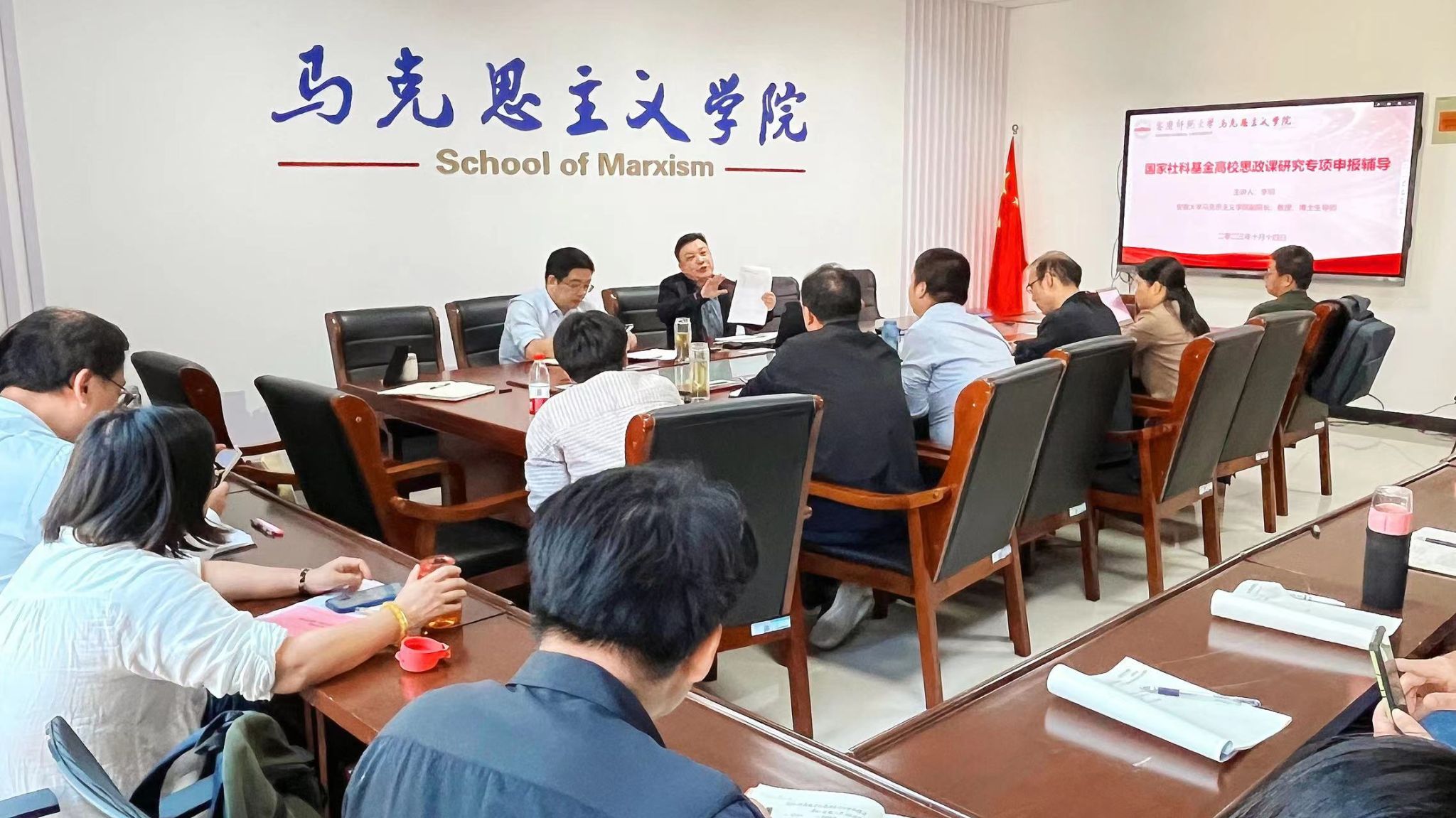 院长严仍昱结合学院工作强调,要高度重视各级各类项目的申报,为更高层次项目的申报与研究奠定基础、积累经验;要对国家社科基金高校思政课研究专项的申报树立坚定信心,对选题精心设计,对申报书精雕细琢,不断提升申报论证质量;要树立科研团队研究意识,依托团队展开论证和研究,做到有组织科研。(撰稿、摄像:任雨欣 编辑:盛佳 审核:张俊生 严仍昱)