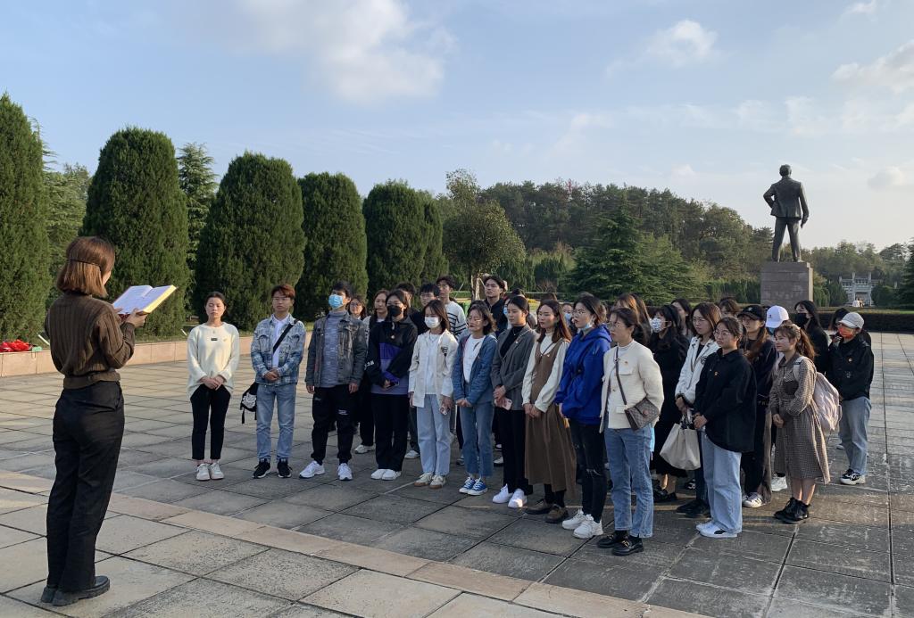 墓园区位于独秀园核心区东部,一条南北向的纪念轴贯穿其中,主要由惊雷浮雕、入口牌坊、柏林墓道、陈独秀雕像、《新青年》碑刻、纪念水池、墓冢等组成。在《新青年》碑刻前,2021级学科思政班的班长边甜甜带领大家一起学习《中国共产党简史》,和大家一起重温中国共产党早期组织的建立及其活动。在陈独秀雕像前,大家集体向雕像鞠躬,向上自己崇高的敬意。2021级马克思主义理论专业高雨晴说道:“作为新时代的新青年,我们要学习陈独秀先生勇于打破旧思想,勇于追求先进思想、坚持民主科学的精神,不断汲取前进力量,成为担当民族复兴大任的时代新人。”