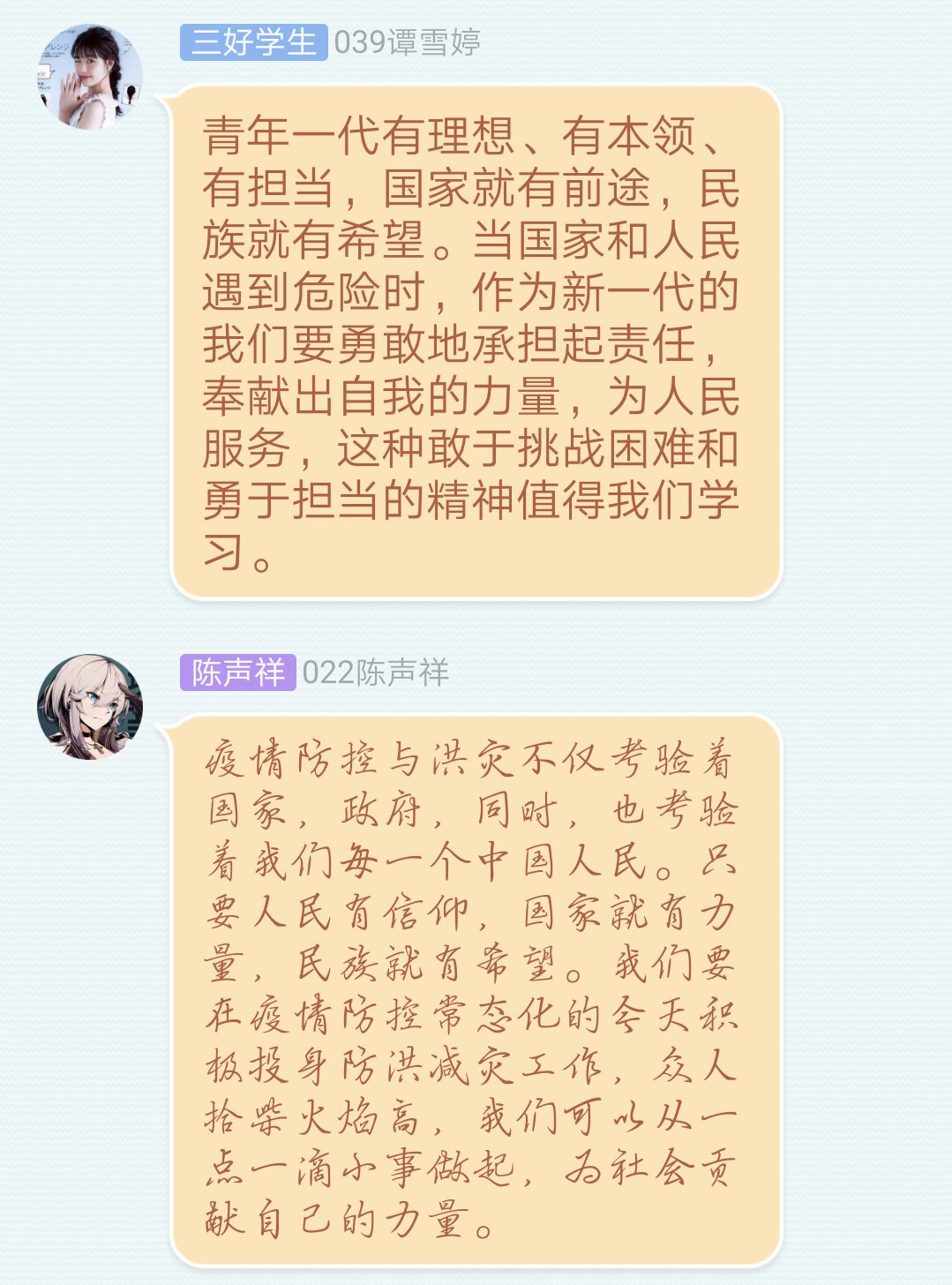 为了更好地宣传郑姣姣同学的先进事迹,beat365在线唯一官网近日在全院召开“学习00后女大学生主动请缨先进事迹”的主题班会。各班同学通过群课堂一起观看了郑姣姣事迹的报道视频。观看结束后,同学们纷纷发表了感想。2019级思想政治教育三班的陈巍巍说:“我们身为平凡的人,小小的心里也应该承载着大大国家和故乡!在这种特殊时期,这种志愿服务的行为很值得我们学习!”“青年有责任有担当,国家和民族才有前途有希望。在社会和国家需要之时,我们应当挺身而出,努力奉献,彰显青年的责任与担当!”2019级思想政治教育专业的黄雨格同学说道。活动开展过程中,郑姣姣同学还与大家分享了自己的志愿服务经历和防汛安全知识。(撰稿:田梦甜 审核:金文斌)