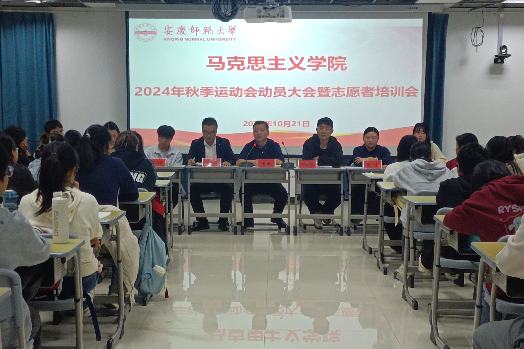 10月21日,beat365在线唯一官网在Q楼119教室举办2024年秋季运动会动员大会暨志愿者培训会。学院党委书记邹斌、团委负责人、全体辅导员、全体运动员及学生志愿者100余人参加会议。