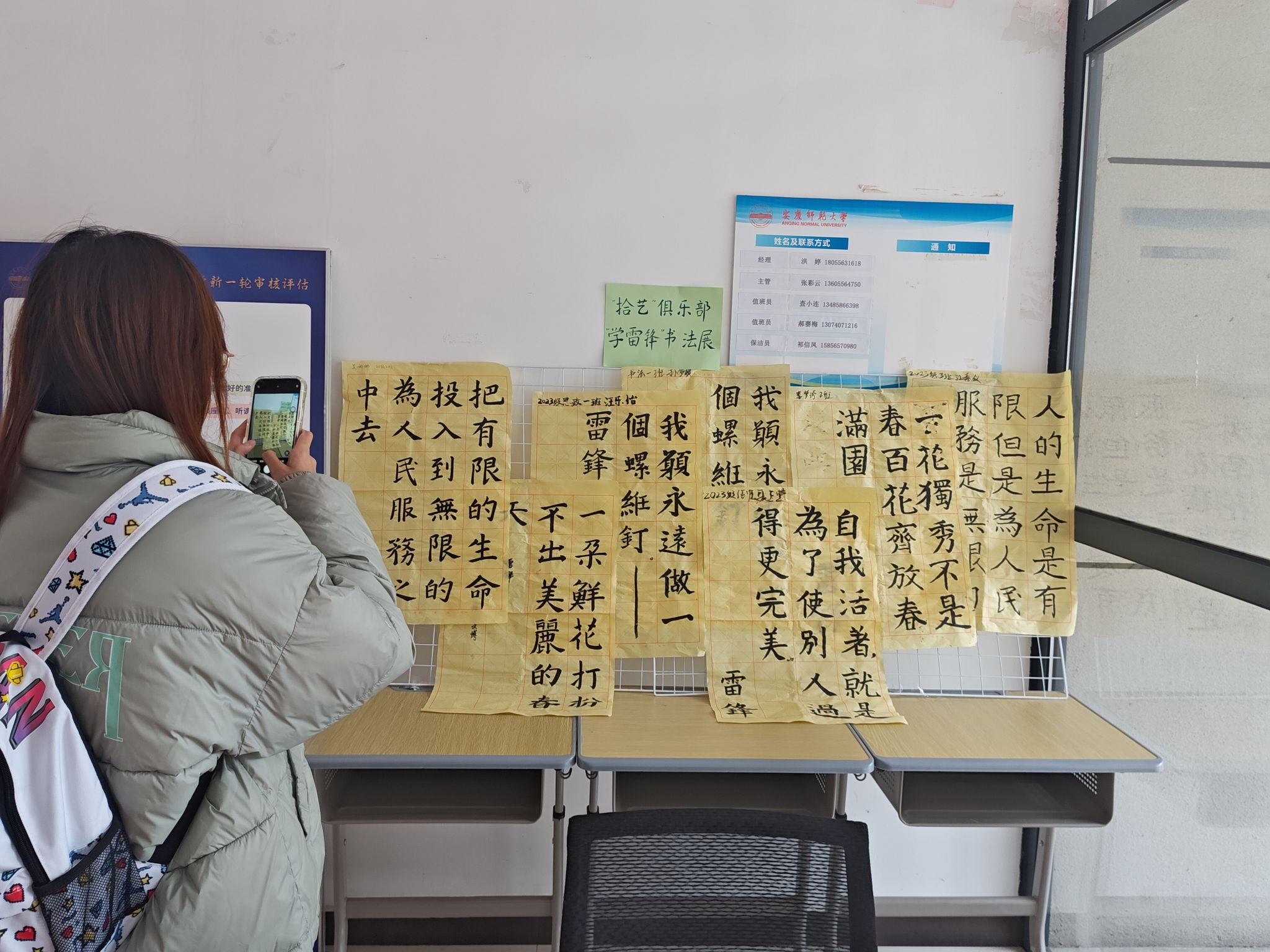 遒劲端正的楷书、活泼有神的行书、放荡不羁的草书……桌上摆放着各式字体的书法作品,引来了学生们的驻足围观和拍照纪念。活动负责人、思想政治教育专业2022级(2)班罗慧柳介绍,这些作品都是由学院“拾艺”俱乐部成员誊写,工作人员提前一周收集并挑选出优秀作品进行展示,“此次书法展为同学们提供了一次充分展现自我的平台,以及热爱祖国、甘于奉献的崇高理想和坚定信念。”