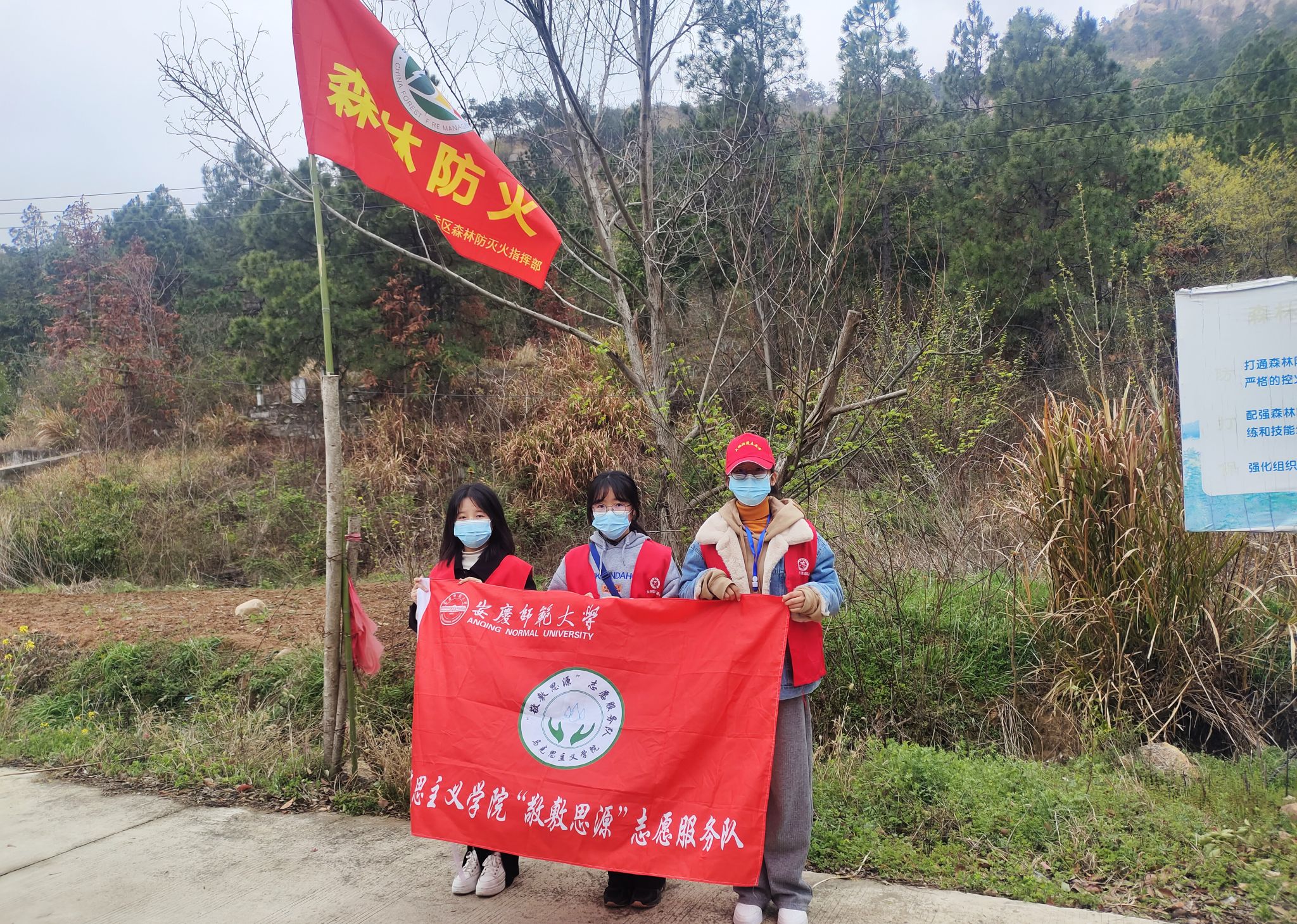 3月18日,学院“敬敷思源”志愿服务队的8名学生前往宜秀区大桥街道眉山村开展“文明用火”劝导行动,并自发组成志愿小组,在各个防火点值班督察,为乡村森林防火工作贡献力量。