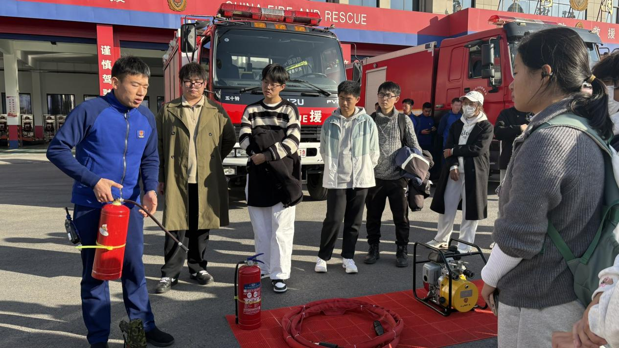 抵达消防中心后,师生首先送上提前准备的书籍、饮用水等物品,向坚守在执勤一线的消防队员致以敬意。消防救援大队王班长结合实际场景,详细讲解了消防车、灭火器、破拆工具等装备的功能用途与操作规范,并现场演示了灭火器的正确使用方法及灭火水枪的实操技巧。同学们踊跃参与实操体验,亲手操作灭火器扑救模拟火源,并操控消防水枪进行模拟灭火演练,穿着消防员专用救生服,在沉浸式体验中掌握基础消防技能与相关知识。