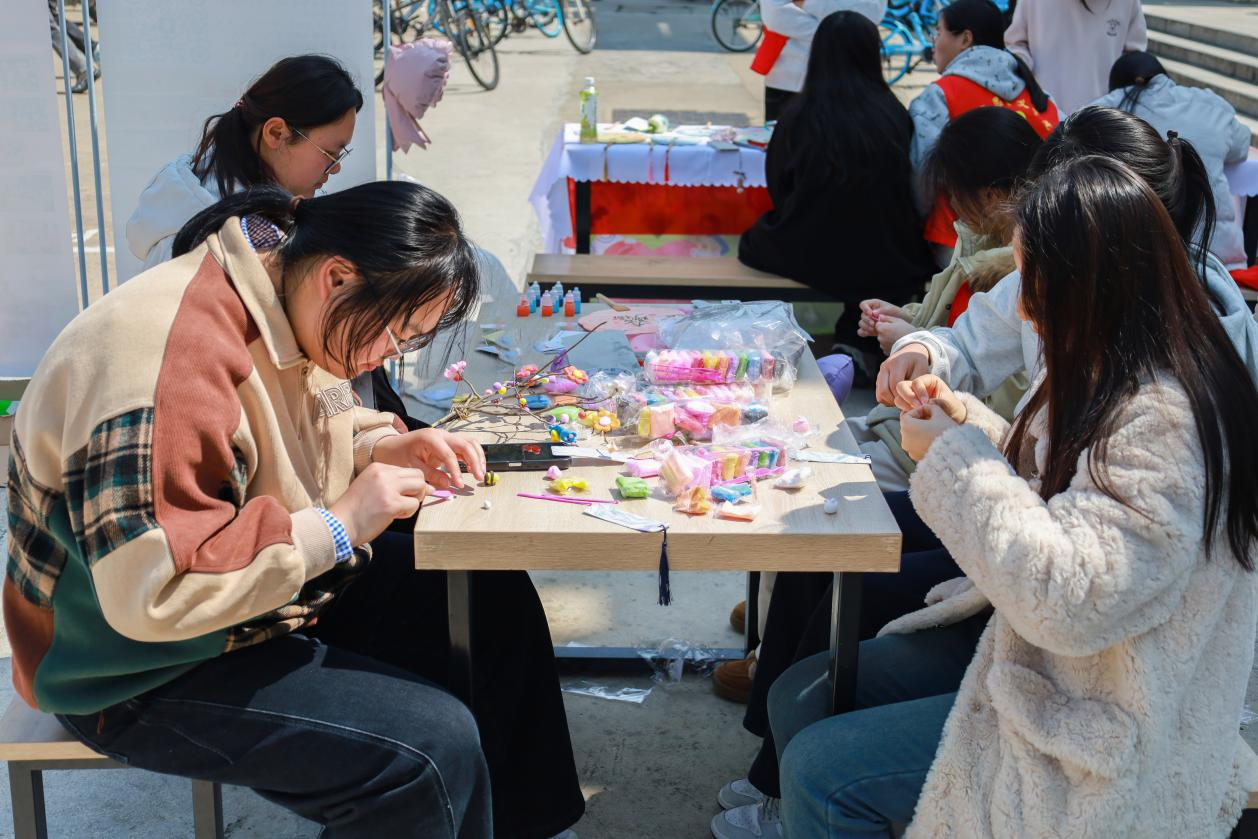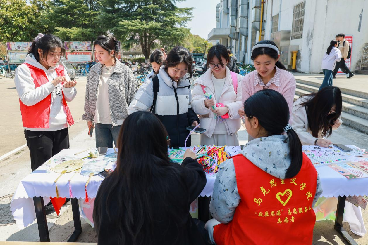 在几张长桌拼接而成的展台前,小学教育专业2024(3)班的陈文静俯身桌前,在明信片上认真地写下对山区儿童的祝福:“愿你像春天的树苗一样,努力生长,向阳而生。”她表示,自己来自农村,对留守儿童的处境有切身体会。“小时候我也盼望能收到远方的来信,所以写得格外用心。”现场,志愿者们还带领参与者们制作书签、黏土、漆扇等小礼物,这些饱含心意的手工作品将与寄语卡片、爱心物资一同寄往山区小学,送到孩子们手中。