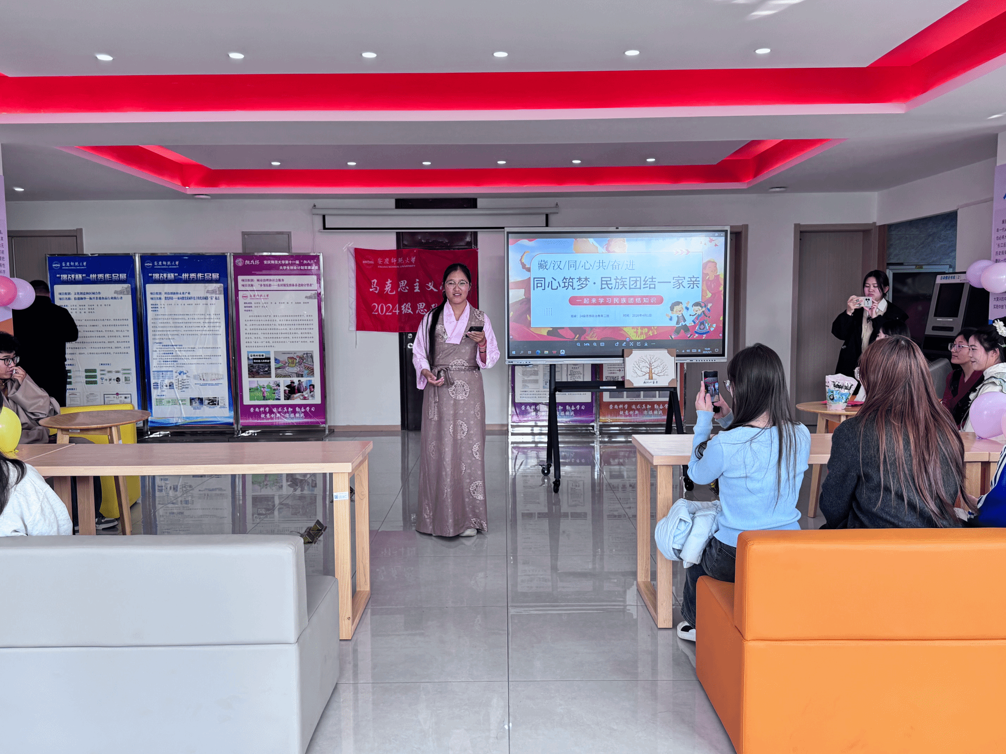 活动中,全体同学共同学习了《中华人民共和国民族团结进步促进法》。在文化风采展示环节,班级同学轮番登场,尽显各民族文化的独特魅力。来自西藏拉萨的强巴卓嘎带来独具特色的藏袍文化展示,她手中洁白的哈达随风轻扬,承载着最真挚的美好祝福。来自西藏山南的云旦卓玛耐心细致地为大家讲解哈达的深刻寓意,让在场师生对藏族礼仪文化有了更深的了解。旦增桑布深情演唱藏语歌曲,悠扬婉转的旋律缓缓流淌,尽显藏族文化的独特魅力;藏袍的绚丽夺目、哈达的纯洁祝福与藏歌的悠扬动人交相辉映,完美展现出藏族文化的独特之美。