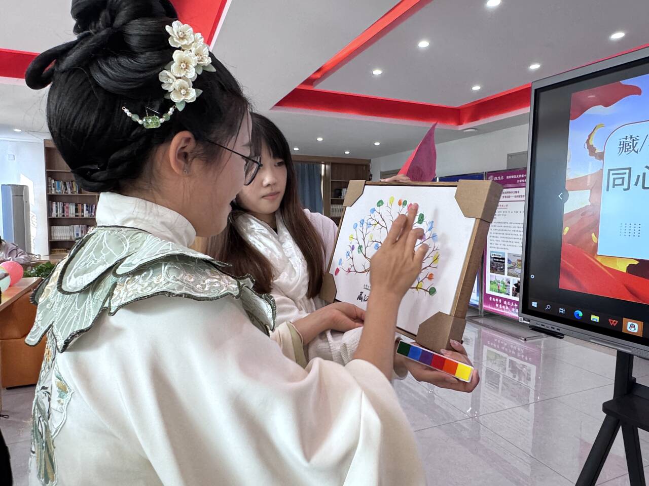互动环节中,“藏汉文化小问答”游戏围绕藏汉的历史文化、传统习俗等内容展开,同学们踊跃参与,在轻松氛围中深化对藏族文化的认知;“哈达传递祝福”游戏中,同学们手拉手围成圈,以藏汉双语传递美好祝愿,让民族团结的种子在交流互动中生根发芽;大家在同心树上按下指纹,象征各民族像石榴籽一样紧紧相拥,凝聚成生机盎然的团结之树。活动最后,全班同学一同齐声演唱《我和我的祖国》,真挚动人的歌声回荡在现场,字里行间都传递着浓浓的民族情谊,也让民族团结的理念深深烙印在每一个人心中。